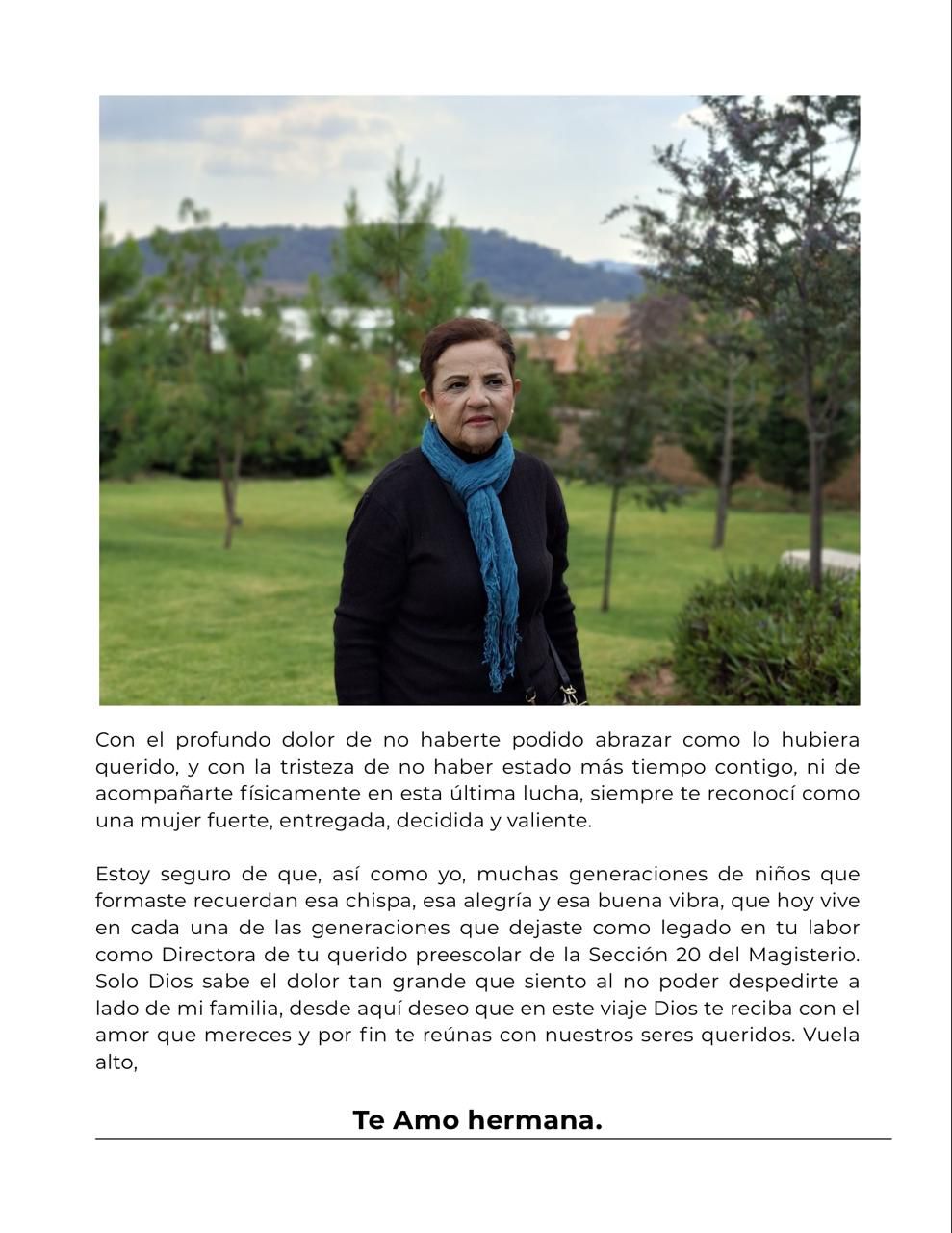 “Estoy seguro de que, así como yo, muchas generaciones de niños que formaste recuerdan esa chispa, esa alegría y esa buena vibra, que hoy vive en cada una de las generaciones que dejaste como legado en tu labor como Directora de tu querido preescolar de la Sección 20 del Magisterio.