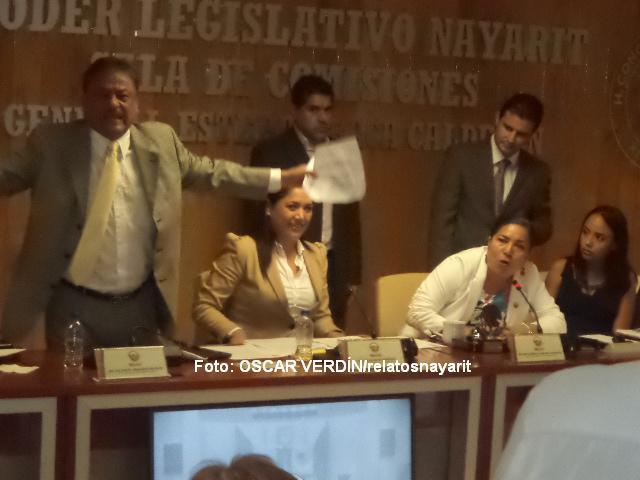 Sonia Ibarra Fránquez, coordinadora de diputados del PRD, recorrió el espacio frente a los reporteros con una “tablet” en mano para mostrar un audio que circula por redes sociales en el que presuntamente se escucha al gobernador Roberto Sandoval Castañeda, entre otras cosas, haciendo comentarios ofensivos contra el presidente municipal de Tepic Polo Domínguez González.