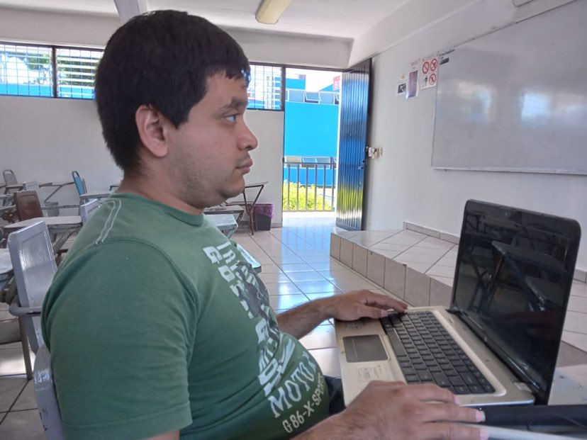 La maestra Alma Cecilia Medina, de la materia de sociología en la Unidad Académica de Derecho de la Universidad Autónoma de Nayarit (UAN), está pasando lista y su estudiante más próximo, sentado en primera fila, es Carlos Montes de Oca Montes de Oca, un joven de 27 años con un padecimiento de ceguera.