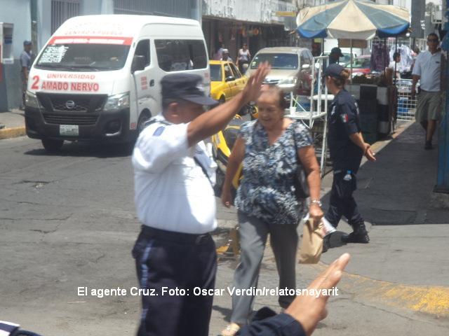 A unos 100 metros de distancia, en la parada de camiones de calle Veracruz, entre Hidalgo y Zapata, el agente Facundo Valeriano Cruz Martínez llega a utilizar el silbato decenas de veces por minuto.