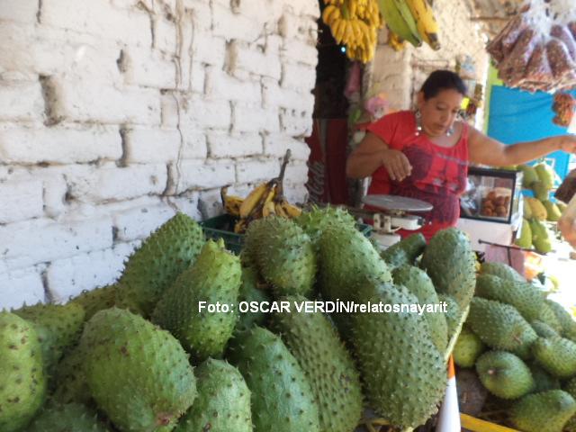 Sobre una mesa de madera hay decenas de guanábanas, frescas después del corte. En otra mesa hay bolsas de plátano, o pan de plátano, o yaca, mangos, galletas, dulces, papaya, bolsas pequeñas con chile piquín seco o fresco. Hay de todo.